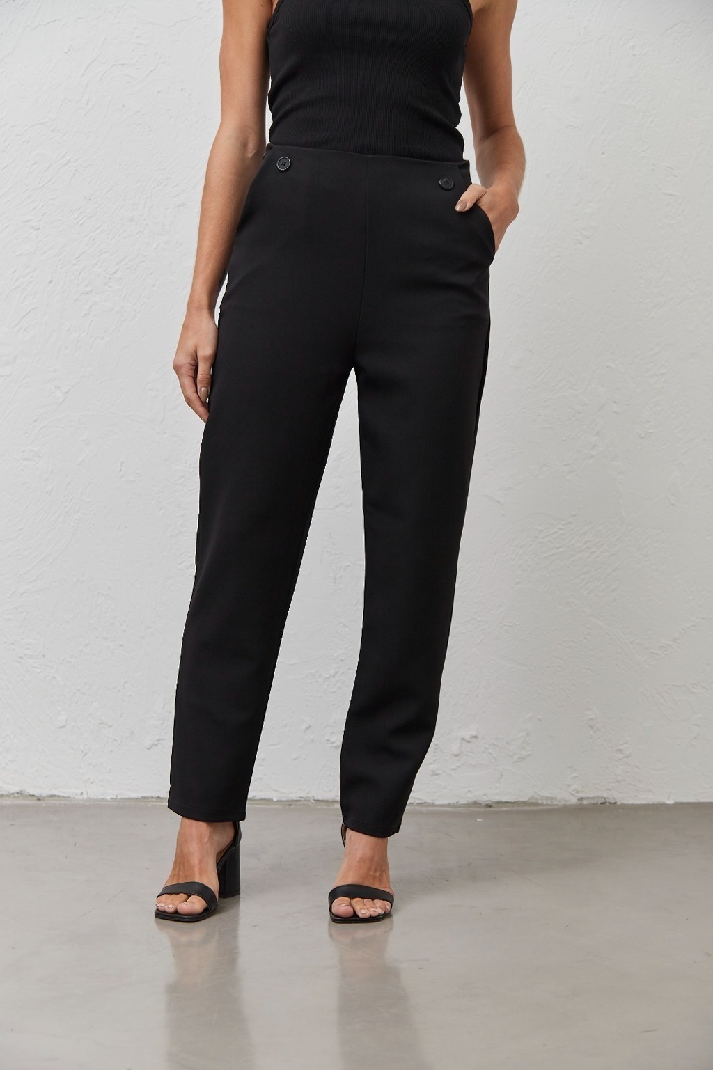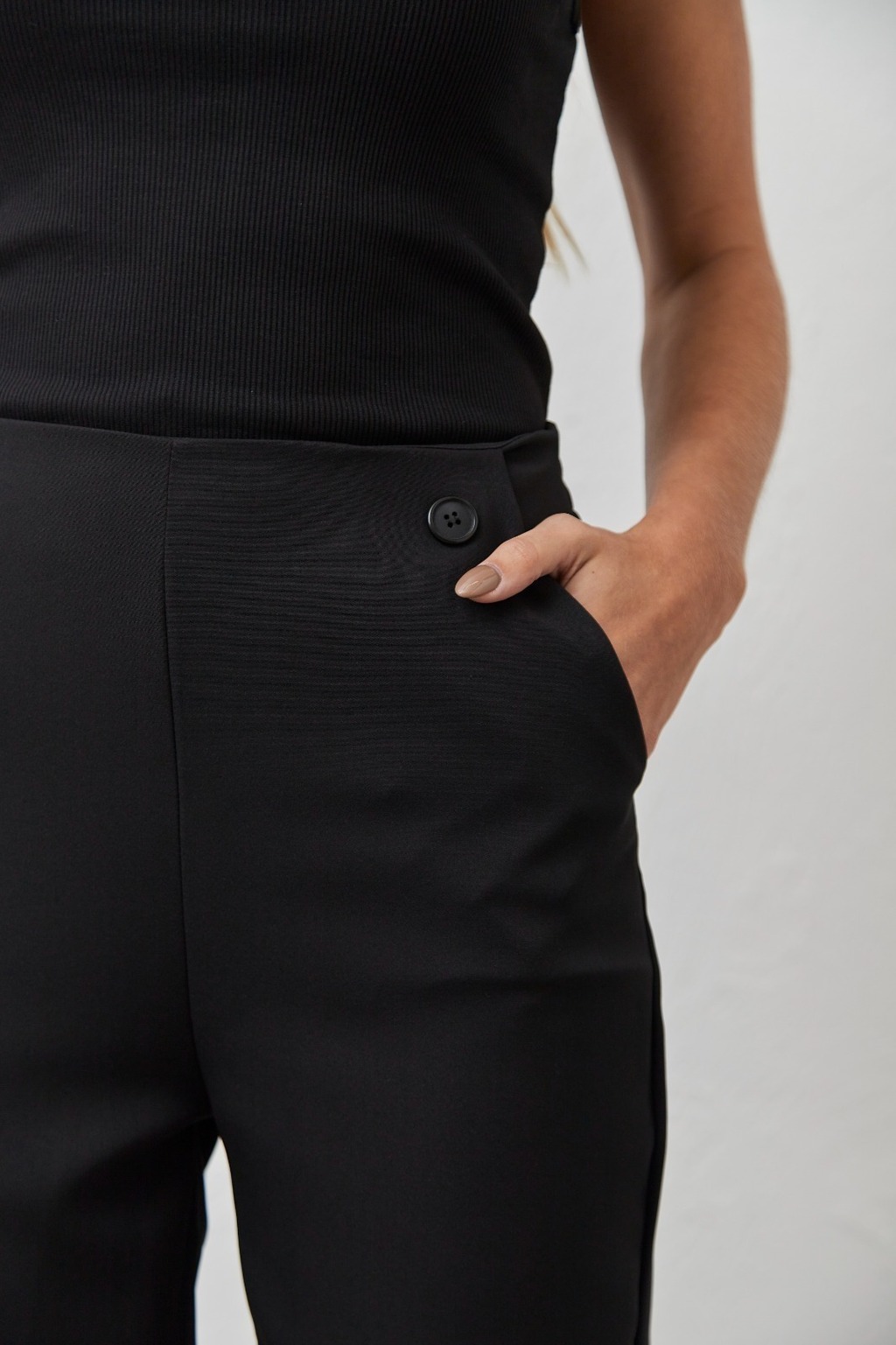 Con elástico en cintura trasera y botón de pasta.
